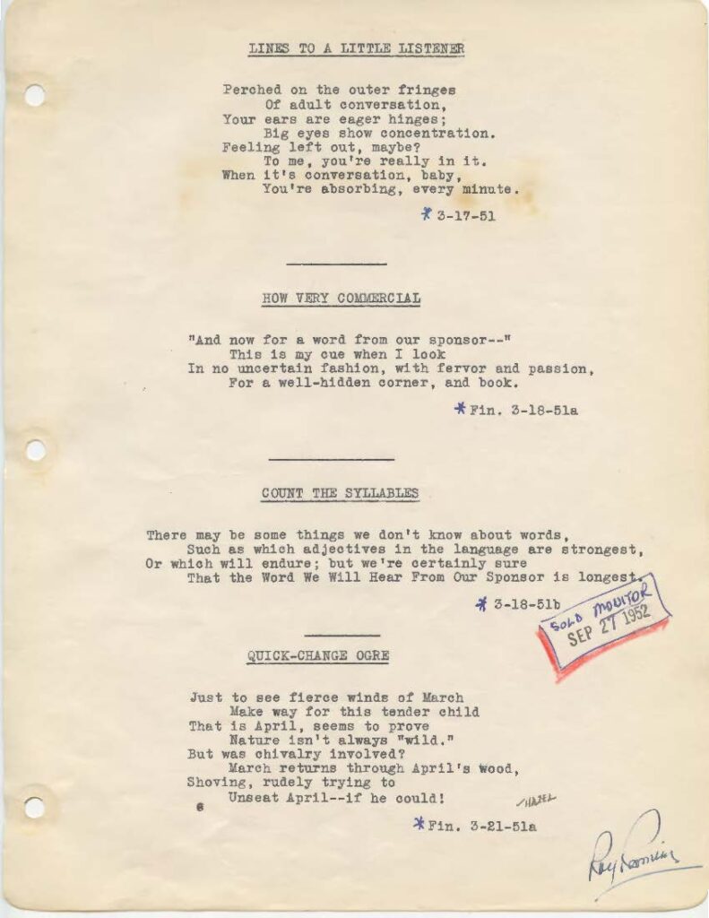 Perched on the outer fringes Of adult conversation, Your ears are eager hinges; Big eyes show concentration. Feeling left out, maybe? To me, you’re really in it. When it’s conversation, baby, You’re absorbing, every minute.