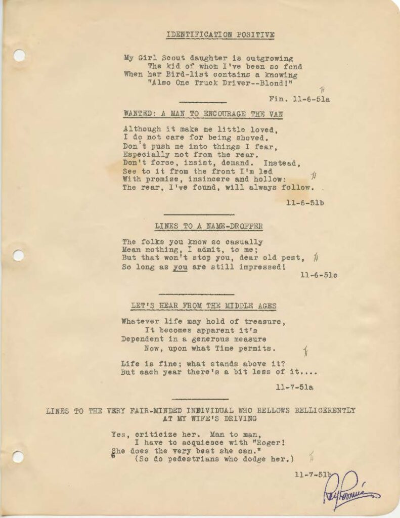The folks you know so casuallyMean nothing, I admit, to me;But that won’t stop you, dear old pest,So long as YOU are still impressed