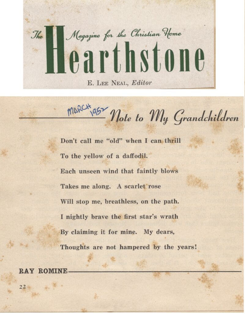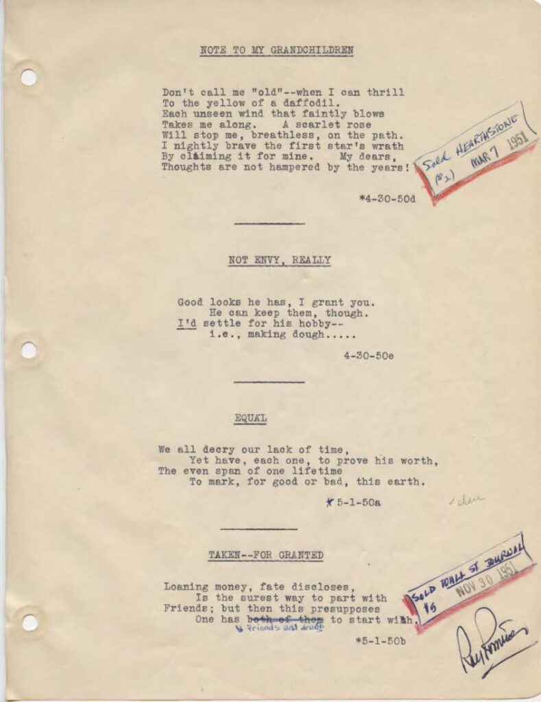 Don’t call me “old”–when I can thrill To the yellow of a daffodil. Each unseen wind that faintly blows Takes me along. A scarlet rose Will stop me, breathless, on the path. I nightly brave the first star’s wrath By claiming it for mine. My dears, Thoughts are not hampered by the years!