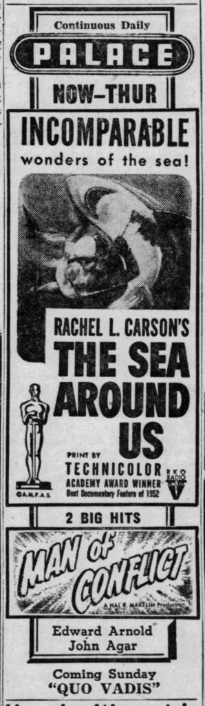 Cold – 8 or 9(?) a.m. Back to work. Home, noon for lunch. To see Hull tonite – half-sold on cartoon idea. To “Sea Around Us” at Palace with kids, after Trella sold wedding at shop.