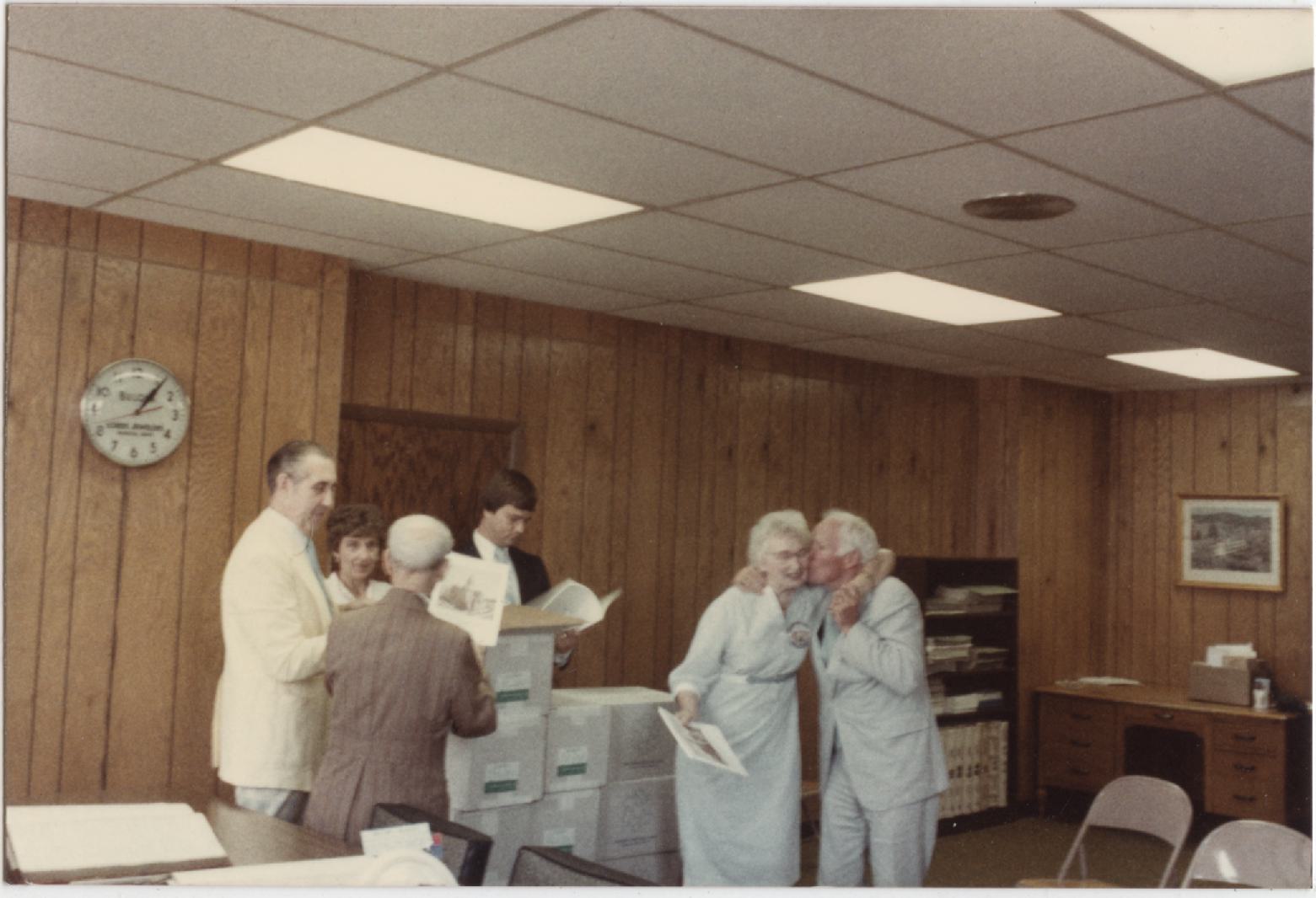 Weeded some after the .7 ” rain. In to shop at 11:30 to await arrival of book- came at 12:15 in a truck from Lesher in Fremont. Couldn’t wait so opened a box and Linda bought the first one. Took 10 boxes to courthouse. County officials gathered in commission meeting room and Dave Brown and I started autographing the 100 copies to sell for $10. Dave Brown said it was great and his opinion means more than anyone else’s. His pictures make it. John Foster, Doc Brown, and Mitchell’s still planning tomorrow’s program. Went to Center and found the courthouse bonds of 1884. Brought home to encapsulate. Picked Queen Anne’s Lace for bouquet for tomorrow.